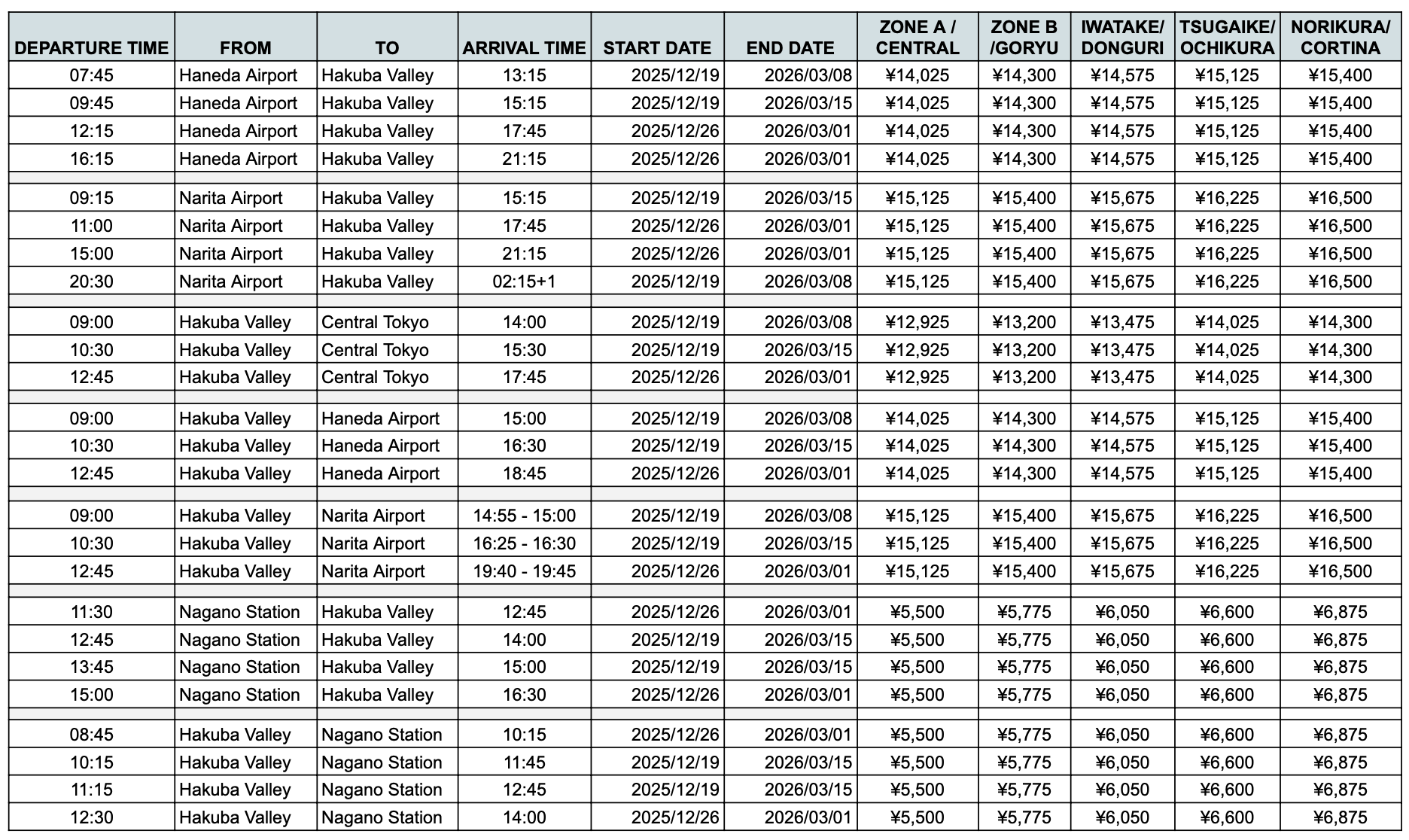 Nagano Snow Shuttle offers direct coach transfers from Tokyo to Hakuba with pick ups at Narita and Haneda airports. These are scheduled daily departures which align with the majority of flight arrivals and departures. Upon arrival in Hakuba you will be transferred in a smaller vehicle directly to your accommodation.