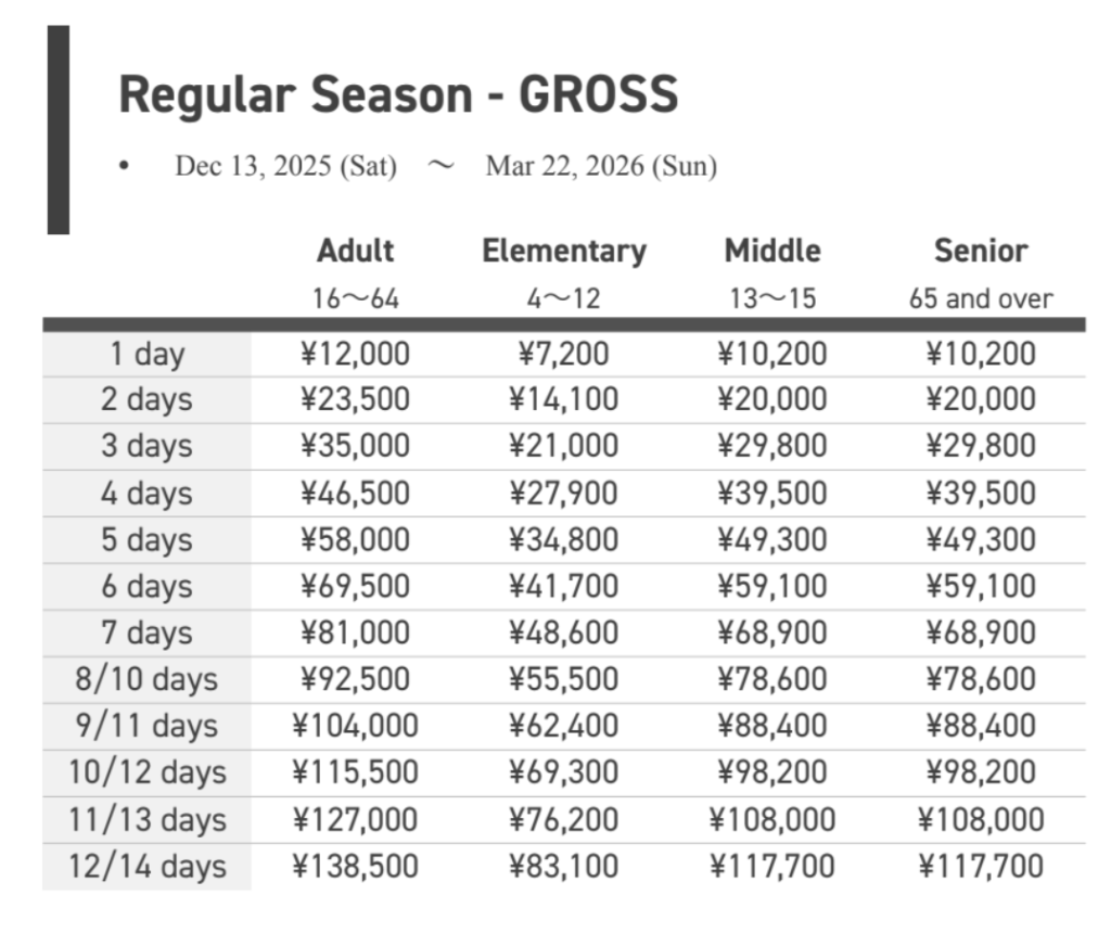 Please note that only All-Mountain passes are available for advanced purchase. If you would like an area-only pass (eg. Hirafu only) this must be done upon arrival at the lift ticket counters located base of the mountain.
