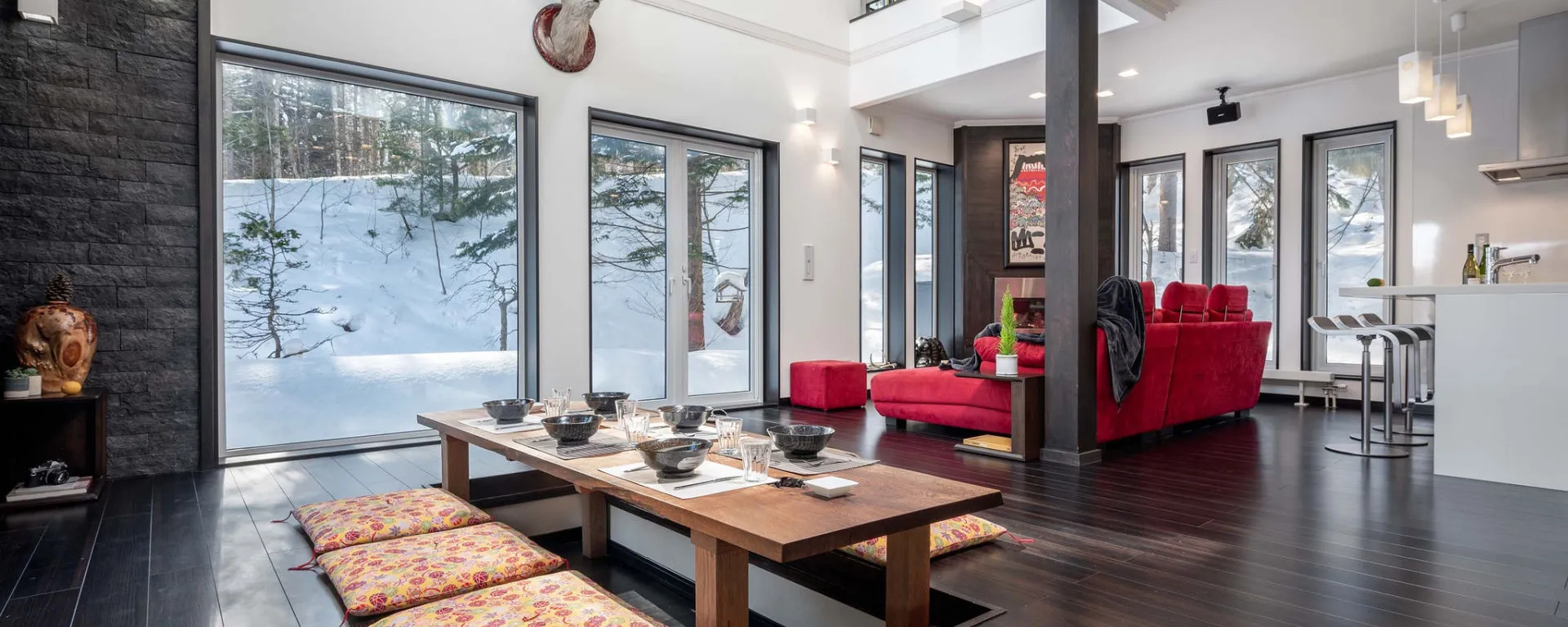 Nestled in the serene Shimogoryo area, Shochikubai Furano offers a tranquil escape surrounded by enchanting woodlands. Situated on the outskirts of Kitanomine Village, restaurants, bars, and shops are within walking distance, providing the perfect blend of convenience and seclusion. At the base of the mountains, just a brief 6 minute stroll from the Furano ski lifts, the location is a winter enthusiast’s dream. Additionally, Shochikubai enjoys easy accessibility – being only 3.5 km from Furano Station, and with a bus shuttle stop outside the property, you are ensured a seamless connection to both nature and urban conveniences.