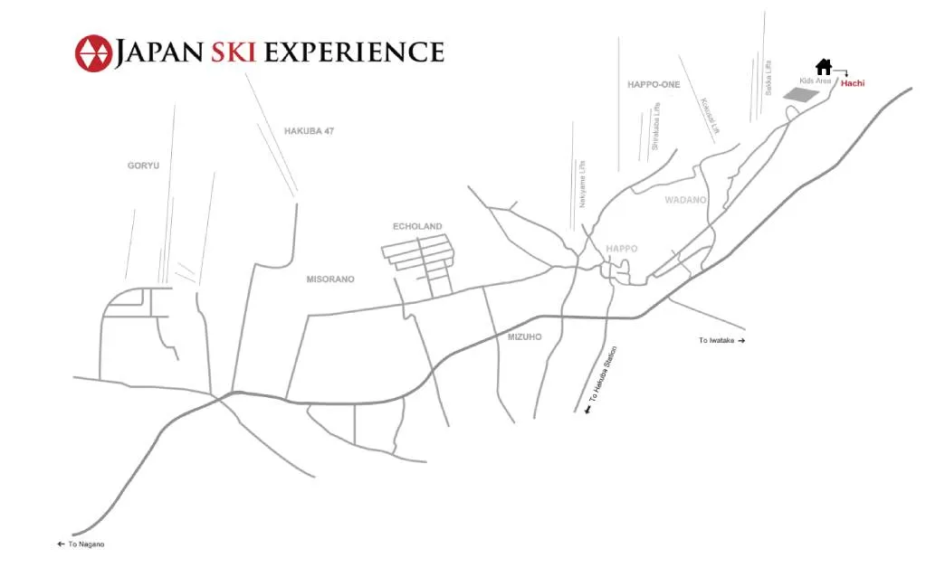 Hachi Hakuba is located in a quiet part of the upper Wadano neighborhood, one of Hakuba’s most popular locations. With excellent easy walking distance to the spectacular slopes of Happo One, here you will also find a nice selection of restaurants, bars and other amenities, including Central Snowsports rental shop and the wonderful Azekura onsen, which is available to rent privately. Upper Wadano sits at the base of Happo One, the largest of Hakuba’s ski areas. This location offers unparalleled access to the Happo One ski lifts at the Sakka base area, which is ideal for beginners and experts alike. With wide and gentle beginner slopes, a kids snow park and easy access to the Evergreen International Ski School, Upper Wadano is an ideal location for families. For more advanced skiers, the Sakka lift base area offers quick and easy access to Happo One’s upper slopes via the high speed Sakka quad lift.
