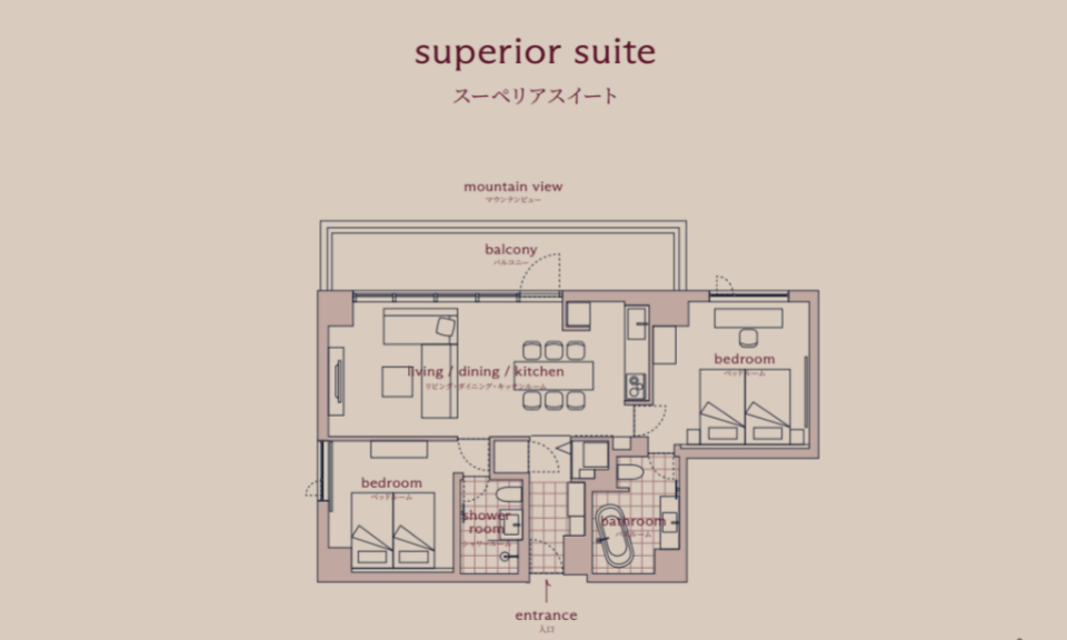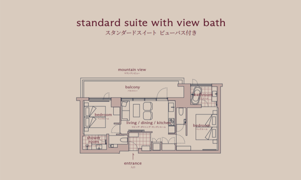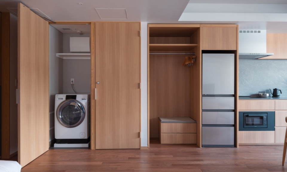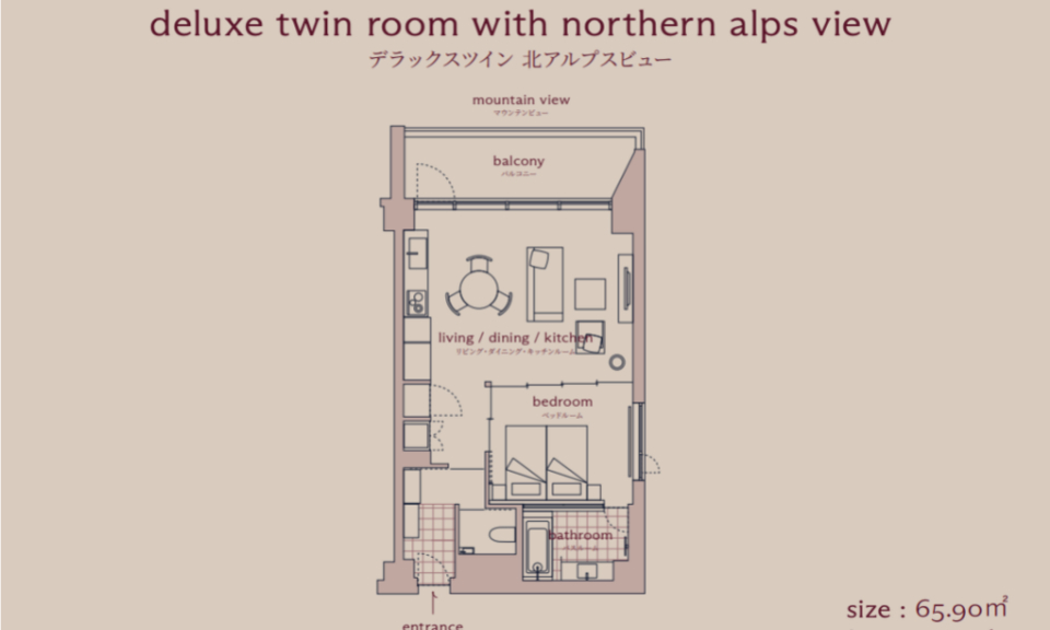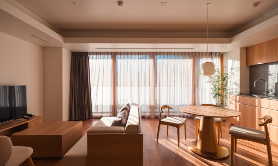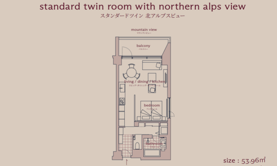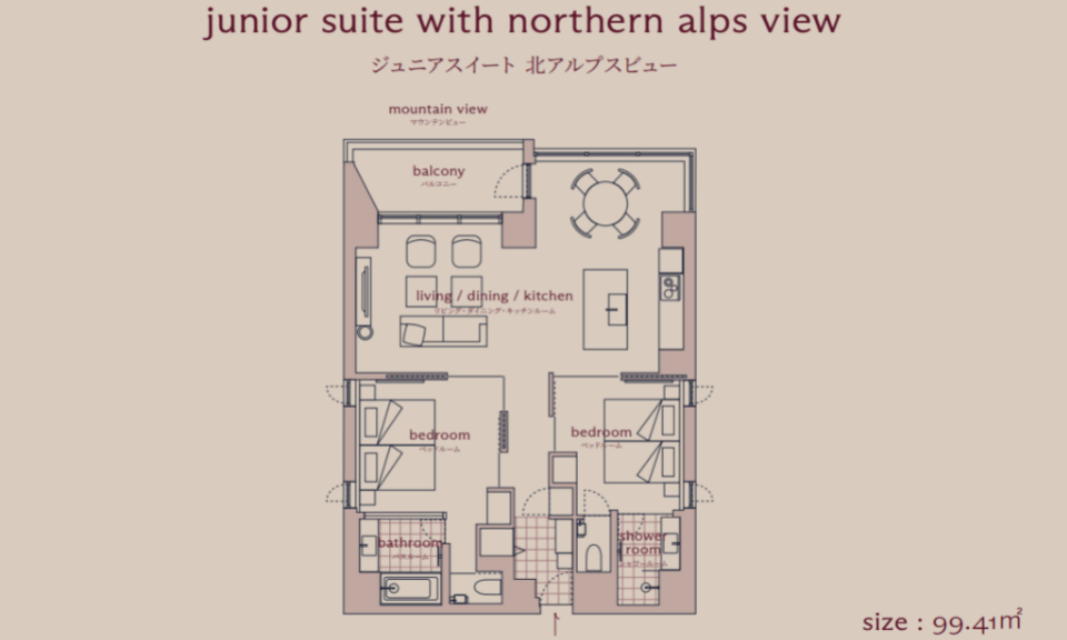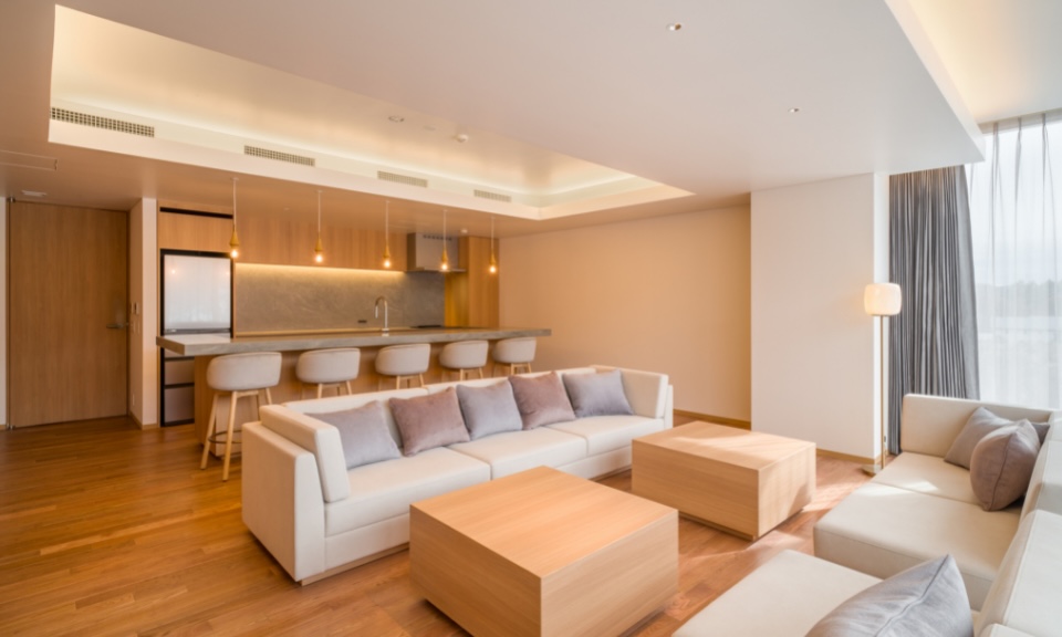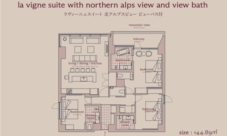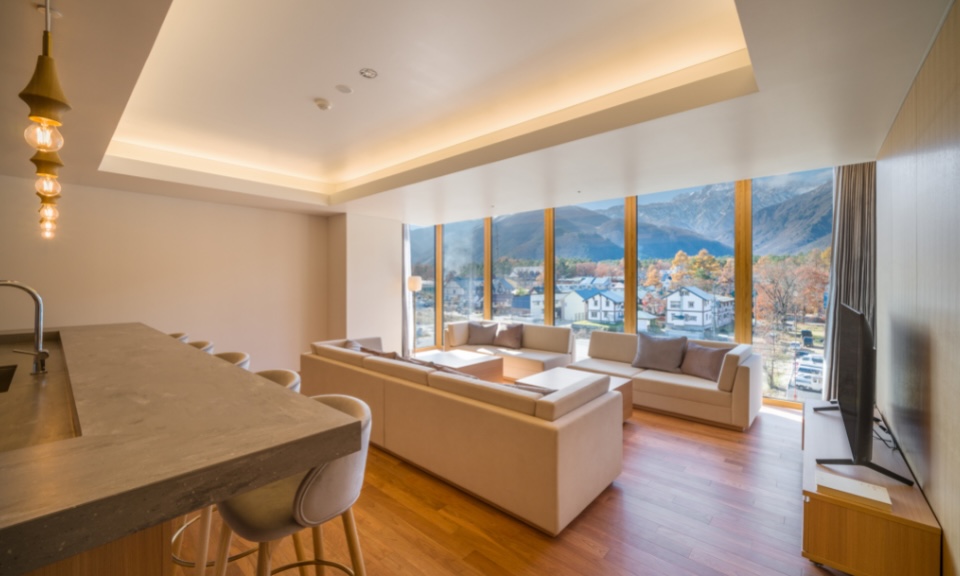 Each of the 38 corner-lot suites at Hotel La Vigne Hakuba looks out to the snowy mountain range, and with 7 room types, ranging from the cosy Standard Twin Rooms to the impressive flagship La Vigne Suite, there is something for every group size. The suites have been carefully-designed to deliver utmost comfort and convenience, with an open-plan living room and kitchen, a washer and dryer unit, as well as an ensuite bathroom in each bedroom. On the ground floor, you will find a dedicated locker and shower facilities for storing and cleaning ski and snowboard equipment.