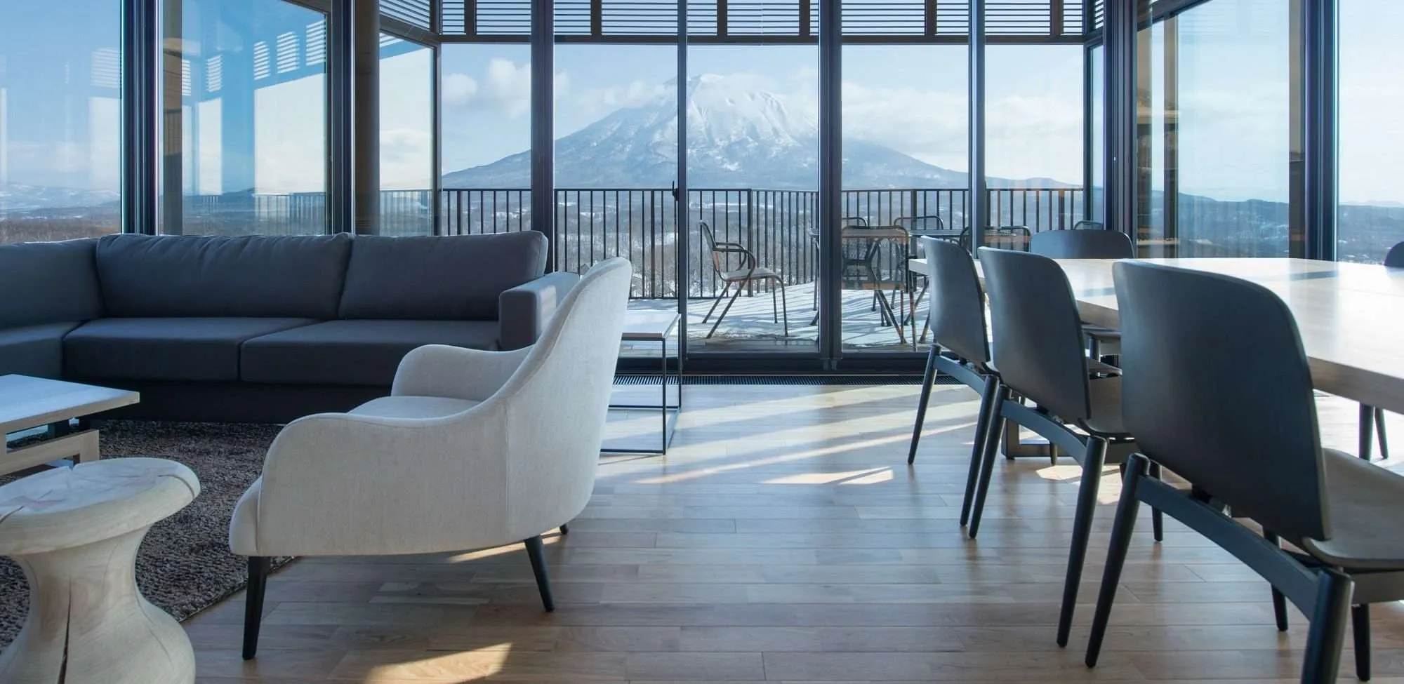 A sophisticated 5 bedroom chalet located in the peaceful and exclusive area of St Moritz Kabayama, Yuzen is one of the few stand alone accommodations in Niseko that can host up to 15 guests in comfort. The top floor of the chalet hosts the main living and dining area, boasting stunning views and an exceptional ambiance.